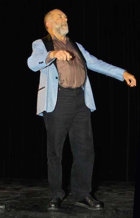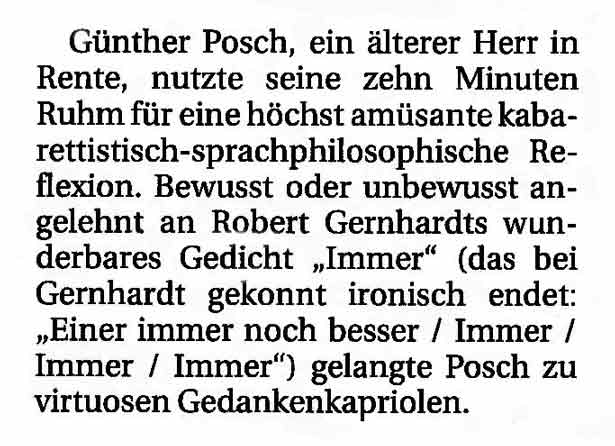 Das Auftreten ist gar nicht so einfach: man weiß mitunter nicht, wann man dran ist. Blitzschnell kann es einen treffen und man muss auf die Bühne. Da kann man leicht feuchte Hände kriegen. Gut ist die Splitternacht zum Üben. Wenn man so selten auftritt wie ich, soll man gelegentlich die Bühne der Splitternacht betreten. Am 6. April 2006 habe ich eine kabarettistische Nummer gemacht. Am 1. Juni 2006 habe ich die 22. Splitternacht in einer Glitzerjacke moderiert. |